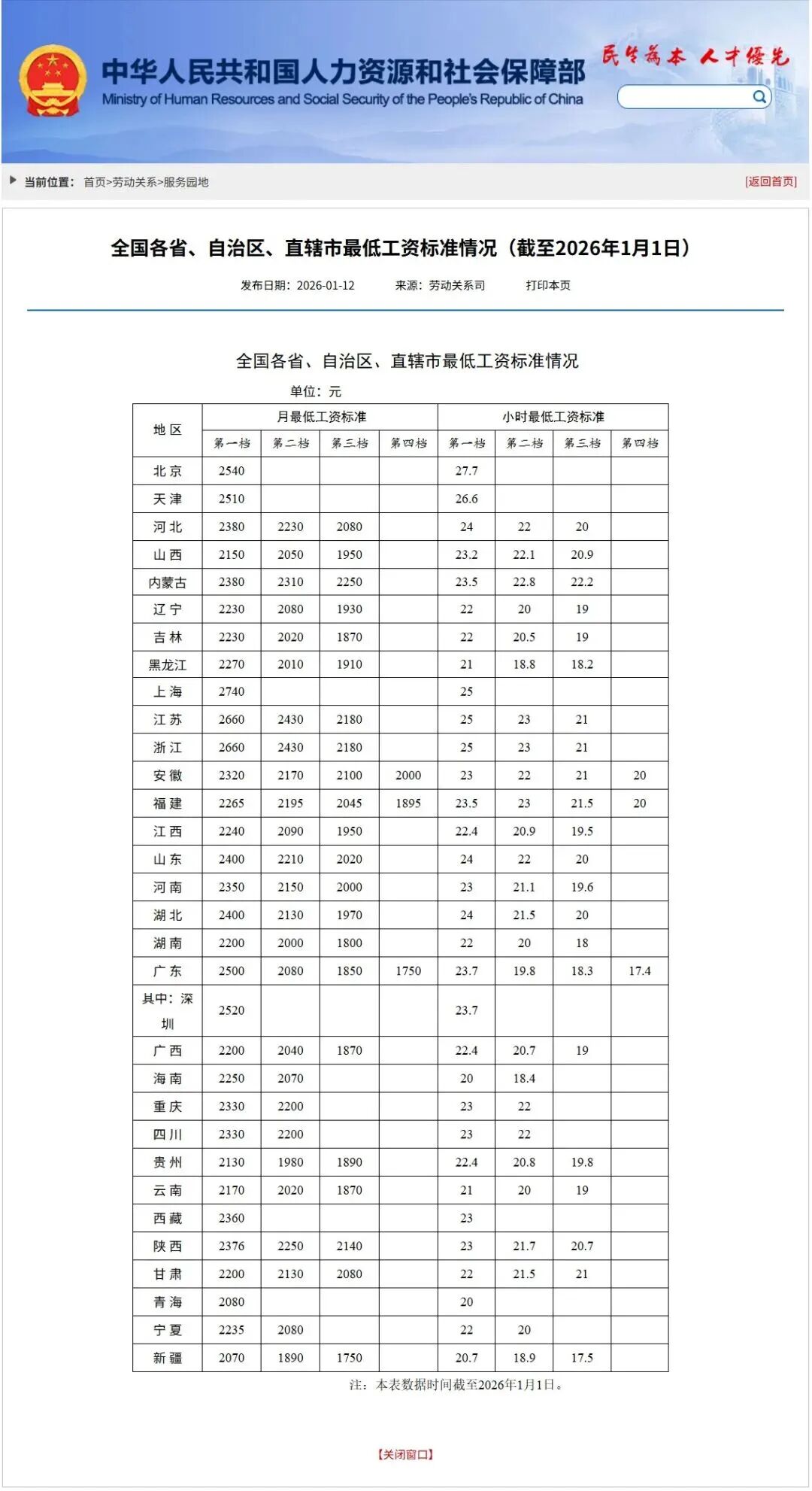 1月12日,人社部官网发布了全国31省市最低工资标准: