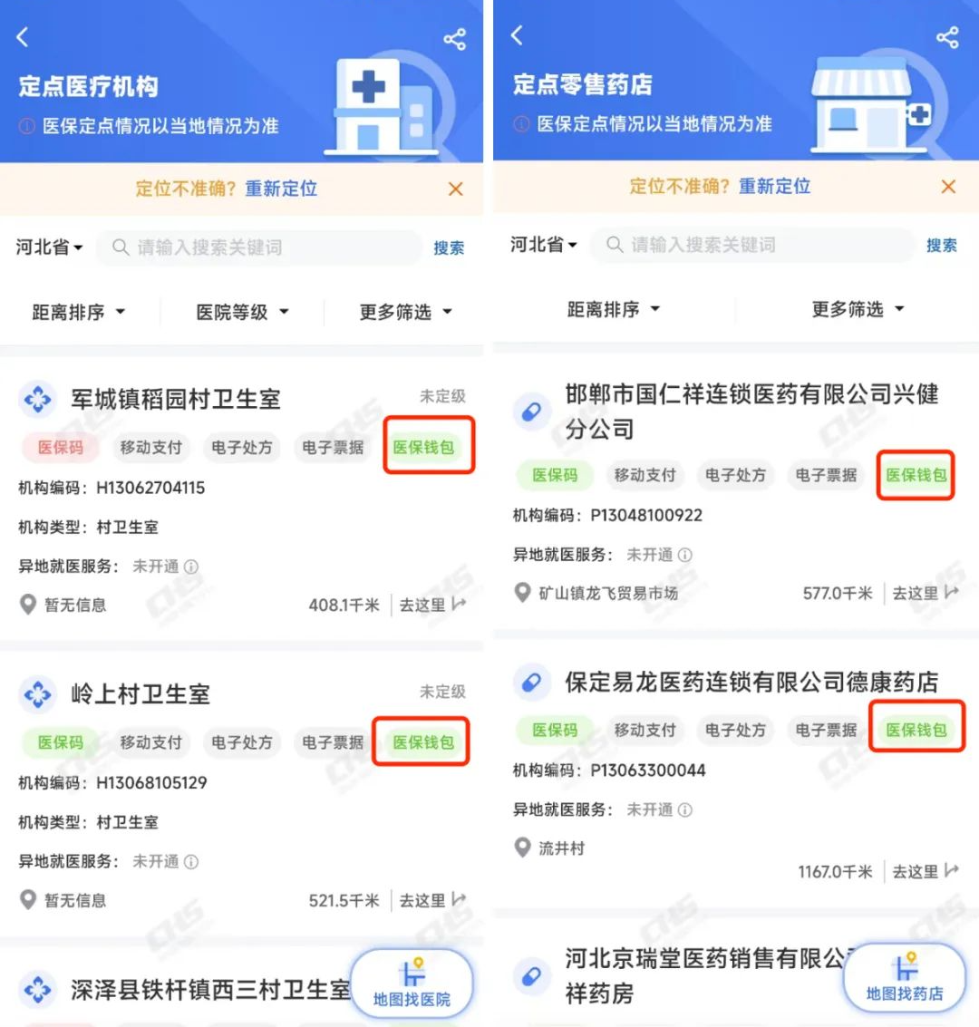 通过国家医保服务平台APP查询服务,【定点医疗机构】和【定点零售药店】,可查询当前已开通医保钱包支付的定点医药机构。